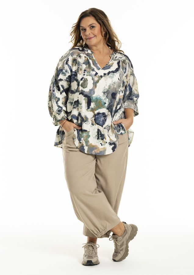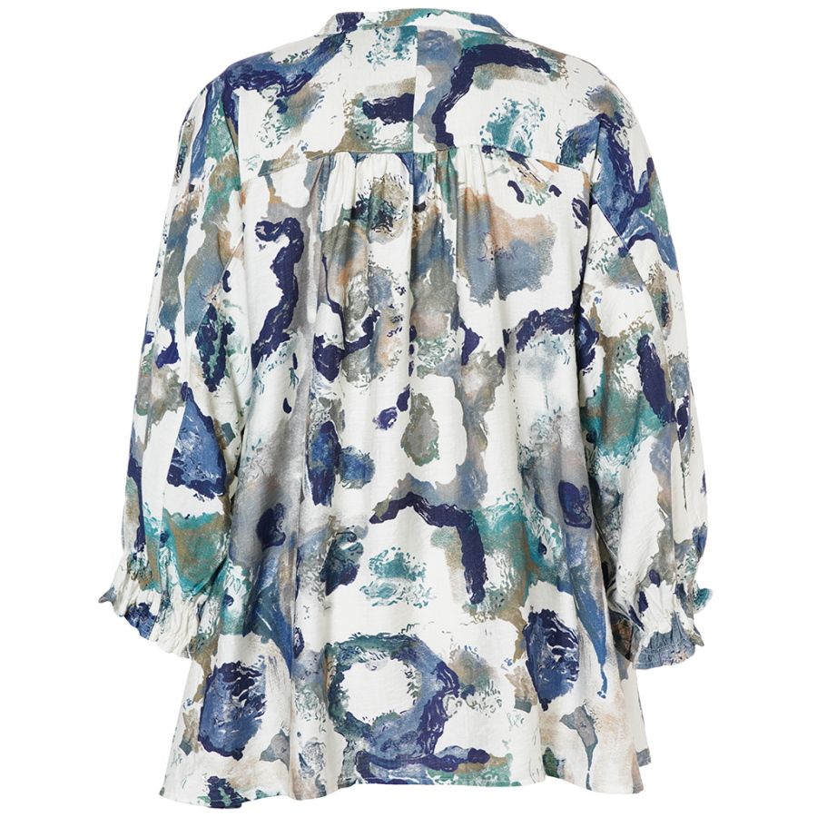 Fin printet bluse i smukke petrol / blå / grøn, 3/4 ærmer der har smock effekt. Forstykket er rundet nederst foran , V hals.